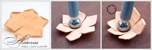 Четвёртую, пятую и шестую детали подкрутить и на мягком коврике придавливать, как бы прокатывая инструмент от центра до середины лепестков. При этом лепестки сами закладываются в одном направлении. ( Вместо специального инструмента пробовала использовать колпачок от лака для ногтей - ничем не хуже).
