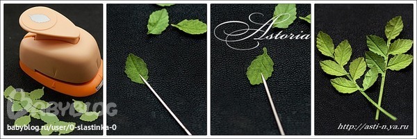 Листики увлажнить. Располагая шило почти параллельно поверхности, проводим линии по центру, краям и снова по центру. Приклеить листочки к полоске.