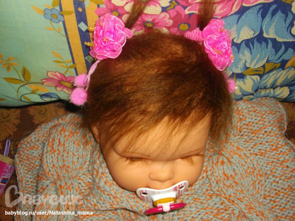 Милаха какая!!! Жаль нет фото" до". Реснички меня покорили:)))))) А волос то как много! Я помнится пыталась пупса оволосатить, пучок вставила, мне надоело, обратно вытащила и лежит опять лысый:)