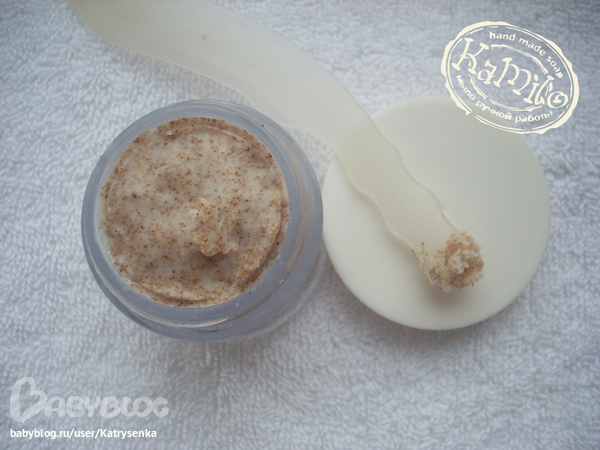 Это скрабик для лица, с кучей полезных масел, витаминок и скрабящими частичками абрикосовой и миндальной скорлупы, а аромат эм Иланг-иланг (немножко афродизиаков не помешает)...Дальше ещё много разного, чего... прошу под кат