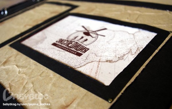 А на других страницах перед тем, как наклеивать бумагу (это крафт плотность 90) я просто её смяла, потёрла, затонировала некоторые складки дистрессом, далее на скотчевую поверхность наклеил бумагу не разглаживая, как ляжет, и потом стала заминать складочки.