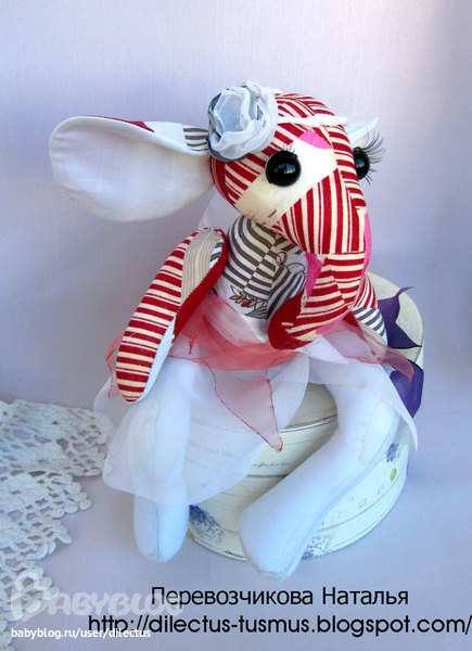 слонов и талисманом для всех худеющих! Очень удобно размещается на полочке, может даже сидеть, свесив ножки.Талисман ищет новый дом ;-))) ... а может стать достоянием общественности, поселившись в фитнес-клубе ... )))Размер - 16 см сидя, а если свесит ноги, то 28 см. Сшита Фитли из хлопковых лоскутков в стиле крейзи-печворк, набита синтепухом и минеральным гранулятом, 5 Т-образных шплинтов, слегка тонирована кофе, юбочка и цветочек на голове из органзы, в руках палочка с атласной ленточкой - атрибут гимнасток.Приобрести Фитли можно в моем и на предстоящей выставке Хелло Тедди на Тишинке 6-9 декабря.