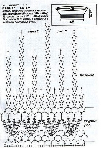 Вот такой беретик, наверняка ВЫ вязали его, я начала вязать, но остановилась на ряду где начинаются веерочки с двумя накидали провязанными вместе, вот смотрите: набираем 4 в.п. подъема, потом 2 ст с/2н провязанные вместе, затем 4 в.п. опускаем в предыдущий ряд и так вяжутся 4 лепесточка, и тут такой вопрос, КАК ПЕРЕХОДИТЬ НА СЛЕДУЮЩИЙ ВЕЕРОЧЕК, может быть там ошибка и между веерками в.п. не провязываются, а из ст. сразу в другой, не знаю, как мне вязать дальше! Подскажите, пожалуйста!!!