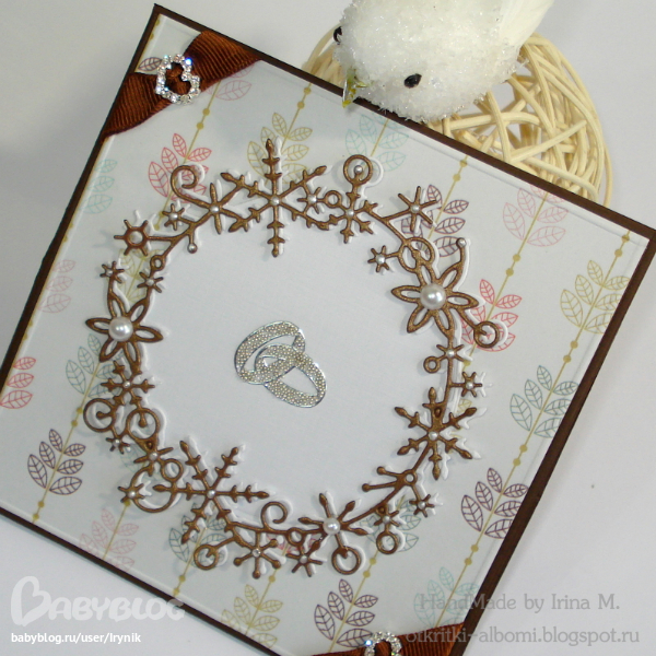 Екатерина. Закзик по мотивам вот этой открыточки и этой коробочки. Моя любимая шоколадная цветовая гамма. Делала на одном дыхании! Снег у нас не лежит пока, но ошущение начала зимы передалось в открыточке. Вырубка со снежинками, снежные капельки, серебро. Все блестит и переливается.