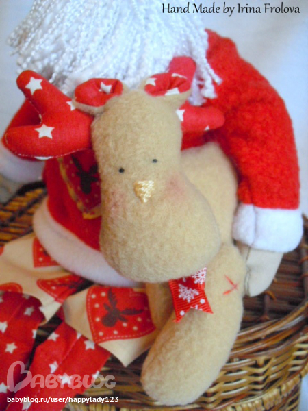 Олень из флиса, рожки и ушки - хлопок; репсовая лента и бубенчик.