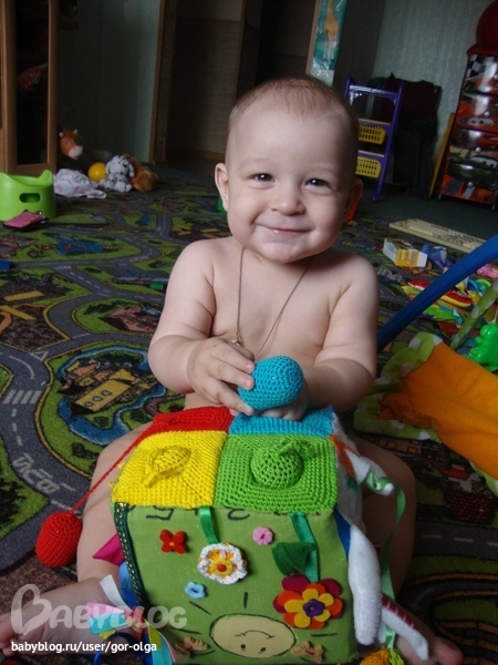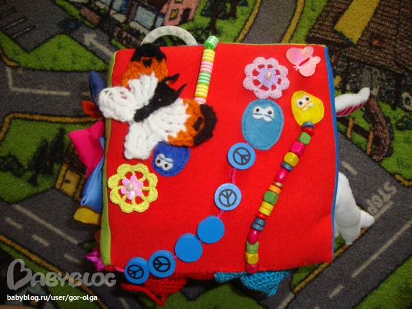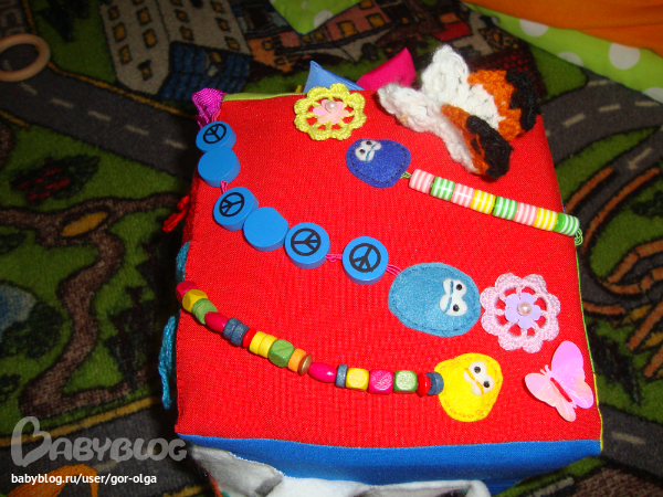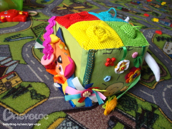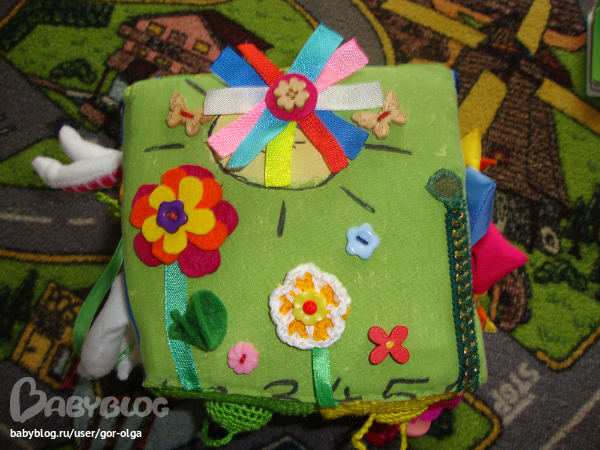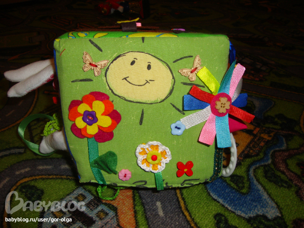 один цветок из фетра, другой вязанный, третий из лент.. вот как раз с ним то я и промахнулась.. планировала сделать его на ленте на липучке. а что-то тормознулась и пришила ленту с липучкой к кубику.. теперь цветочек отдельно, но сынок хорошо прилепляет его к ковролину