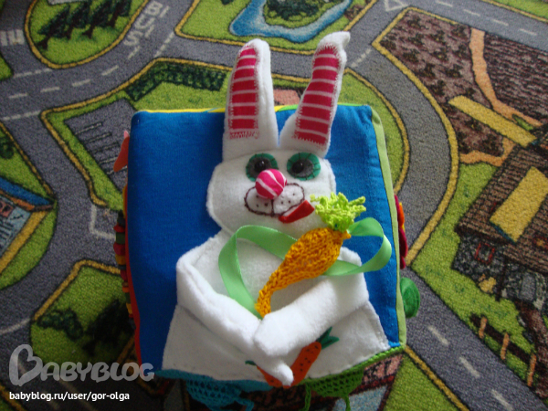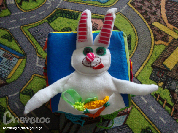 Какой то он страшный получился... На лапках пришиты липучки, что бы держать морковку.. но морковка не держится.. зато лапы хорошо цепляют ленты и оставляют там зацепки.. Ушками можно играть в "ку-ку" и лапками тоже, еще лапки прячутся в кармашек. Морковка очень понравилась на зубок моему малышу.