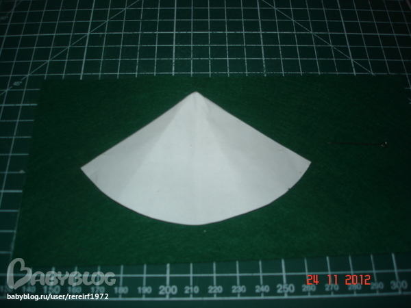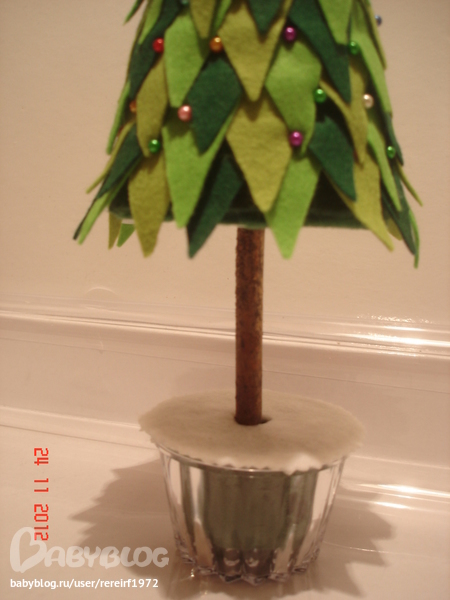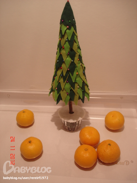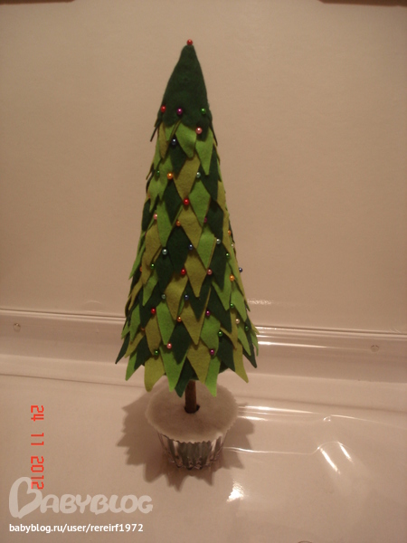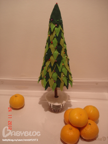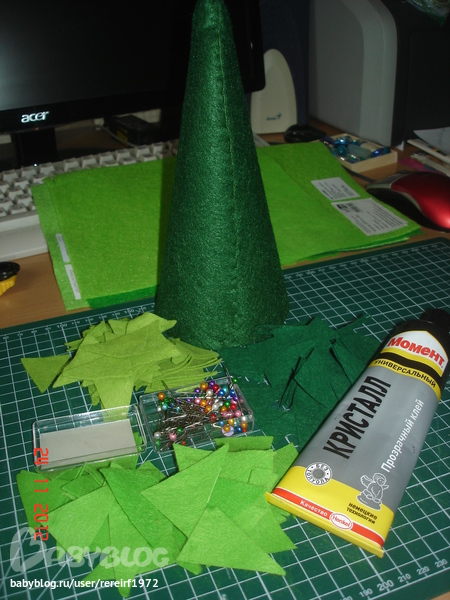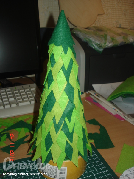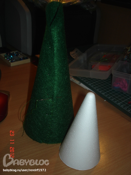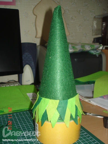 берем конус 20см, обшиваем его зеленым фетром .(можно вообще не обшивать).