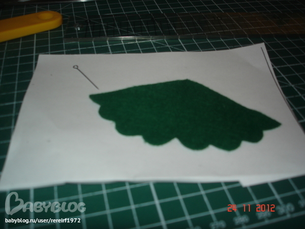 Доходим до самого верха. Вырезаем из темно-зеленого фетра верхушку, сворачиваем пополам, фигурно вырезаем по низу,сшиваем, выворачиваем.И надеваем на макушку елки.