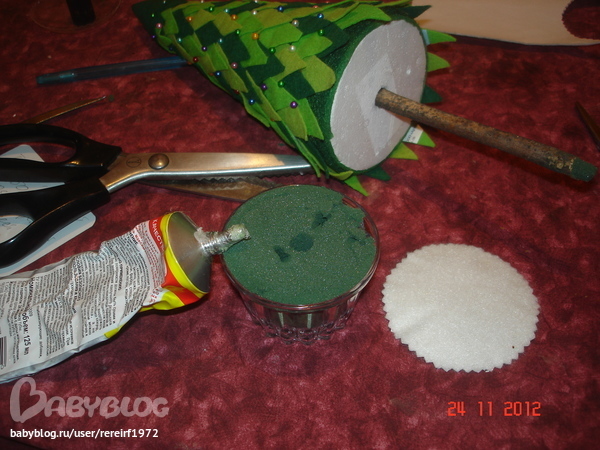 Смазываем СТВОЛ и дырку в пене клеем,сверху кладем белый фетр и аккуратно вставляем ствол в основание.И начинаем прикалывать бусины .У меня правда все наоборот сделано)))