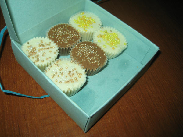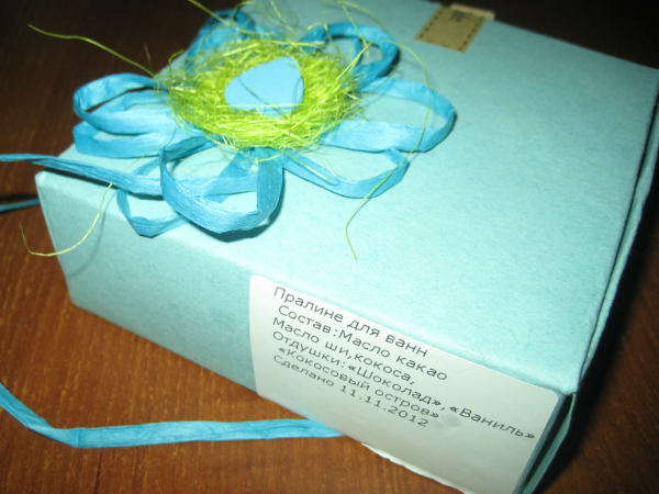 Коробочка с .... Пралинешками. ММММ.... Как они пахнут!!! Я вот уже три штучки на себя израсходовала!!! И кожа после них мягонькая-шелковистая)