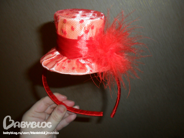 Шляпка сначала сделалась из картона, потом обшила ткатью, ободок был синий))) обшила красной лентой) и пришила прозрачными нитками к ободку) + еще на клей посадила для крепкости)