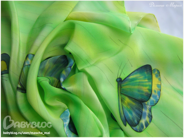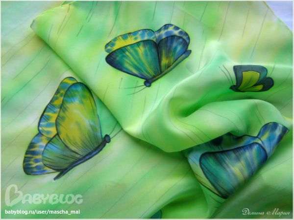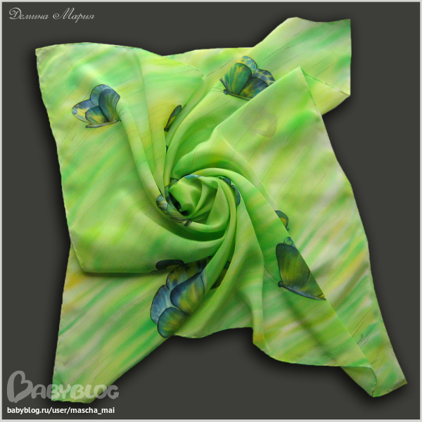 Платок расписан по эскизу заказчицы. Крепдешин (100 %шелк), холодный батик и свободная роспись.