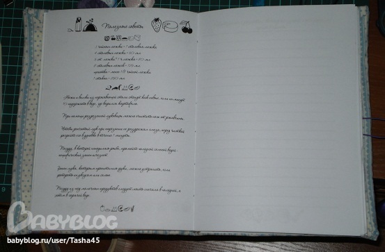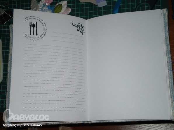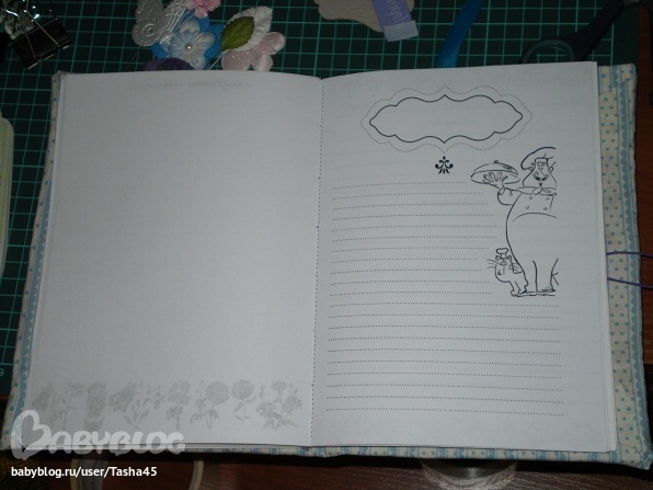 обложка слишком пестрая. много декора, а так же как и внутри - перебор. многовато разных цветов. старайся цвета подбирать, если синяя нежная гамма, не надо ярко голубых.. ткань же нежненькая!!!