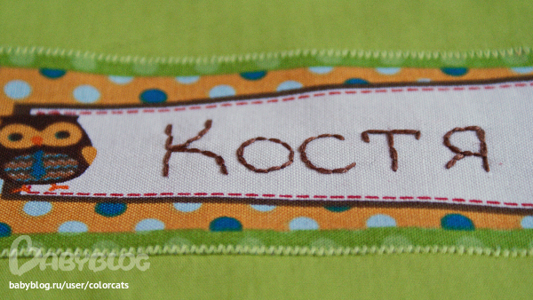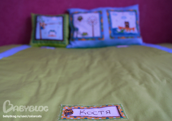 Покрывалко размером 100 на 120, две подушечки: одна квадратная - декоративная, вторая - прямоугольная застегивается сбоку на потайную молнию - ее можно набить, а можно использовать как наволочку, надев на подушку для сна. На обратной стороне пледика есть вышитый именной ярлычок "Костя".