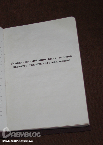Мягкая обложка. Страницы состарены кофе и пахнут кофе и миндалем. Страницы разлинованы, с жизнеутверждающими высказываниями.