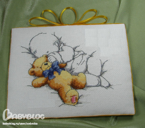 вот моя оформленная вышивка))) есть кстати из этой же серии "дочурка", но она с зайцем и именно с розовым бантом