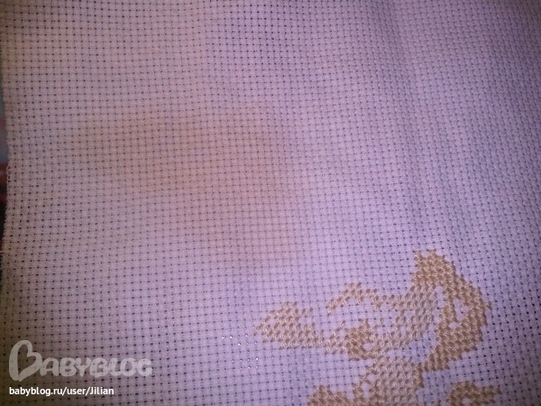 Еще актуально? Если канва не цветная (как в этом случае) - пятно от чая намочить 10% лимонной кислотой, через 10-15 миню прополоскать водой. Попробуйте, потом расскажите, помогло ли?
