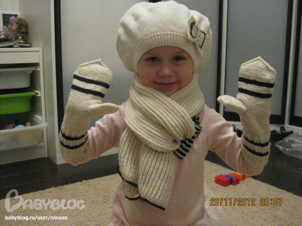Викуля, спасибки! Еле сняла с нее. Я пока варежку вторую вязала, она уже первую утпщила, потом стала варежки доделывать, она уже шарф наматала на себя. Весь вечер за ней гонялась!