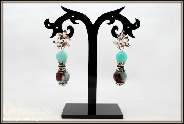 10. Серьги "Весна" Металлофурнитура, посеребренные серьги-гвоздики, бирюзовый тонированный жадеит с огранкой; агат бирюзово-шоколадный, ювелирная огранка. Длина со швензой 5,5см