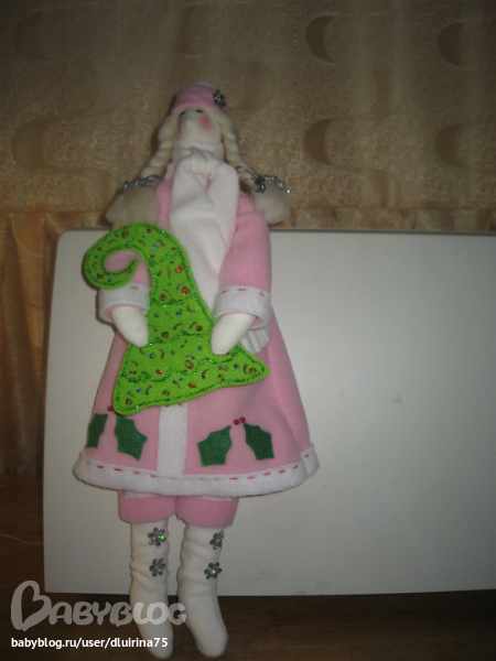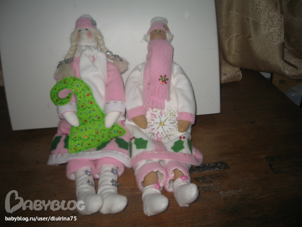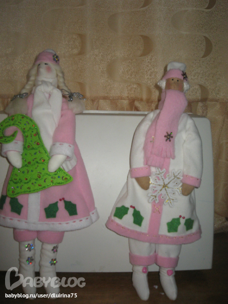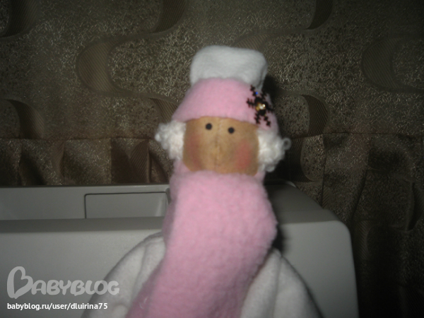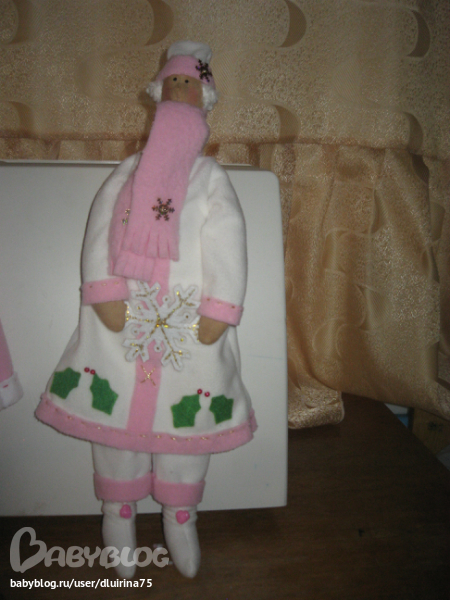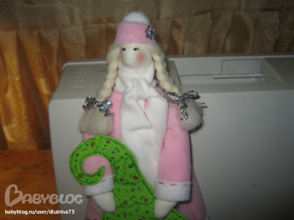 Сшила вот таких снегурочек. Правда с одной беда случилась, глаза решила нарисовать краской.Нарисовала и стала поправлять волосы, а краска еще не высохла и один глаз размазала, пришлось и на втором как бы ресницы делать! Вот что получилось: