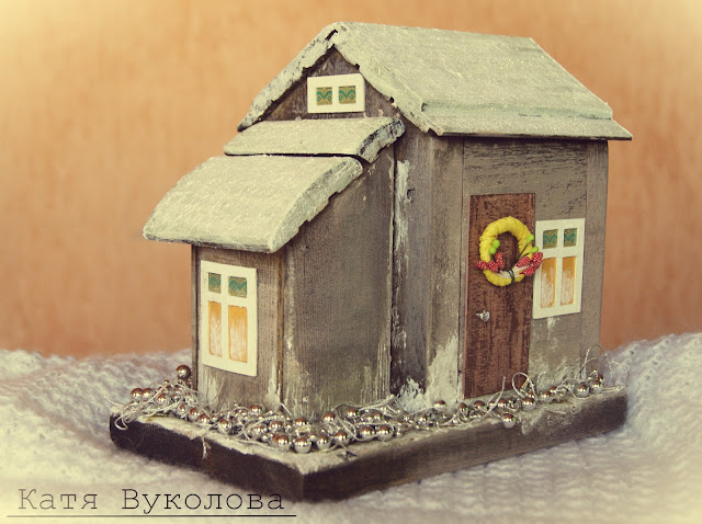 Юра сколотил домик, а я его немного украсила: покрыла краской и пастой, сделала окна и дверь. Эля выбирала цвета и подавала мне шарики-гирлянду)