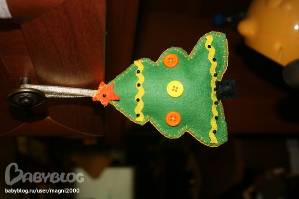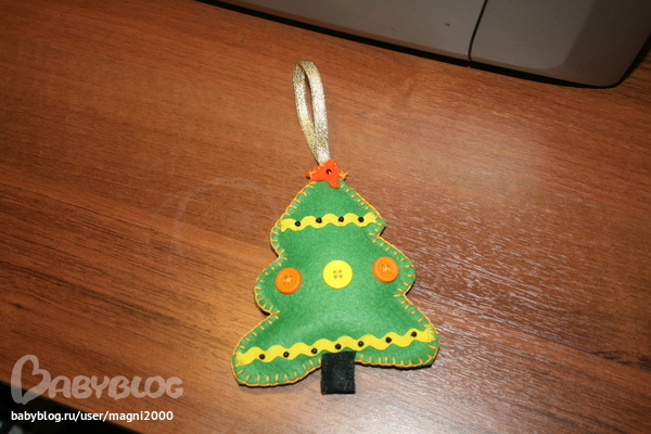 купила фетр еще в сентябре, потом еще подкупала бисер и нитки... а пару недель назад купила пуговки и (забыла название), и за 3 часа по совокупности и 2 вечера получилась , придумать и сделать вот такуюелочку..... аж дарить далко... хочется оставить себе.....