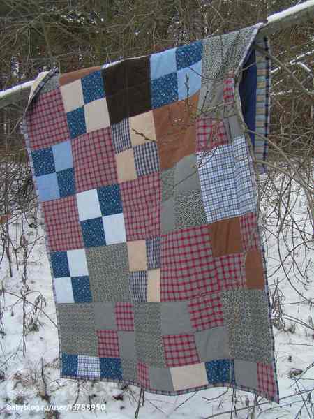 Наталья, спасибо, ткани я долго собирала для этого одеяла и сшить его давно собиралась, а т.к. шить - это моя работа, то до своих руки как всегда не доходят..., пока муж не отобрал мое одеяло, я сразу и время выкроила и блоки сами придумались, и сшила я его за три дня... Рубашки в дело пошли и любимые летние льняные штаны беж...