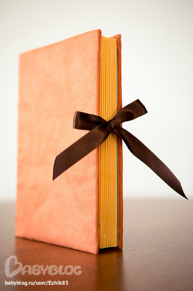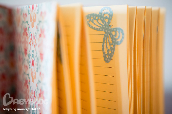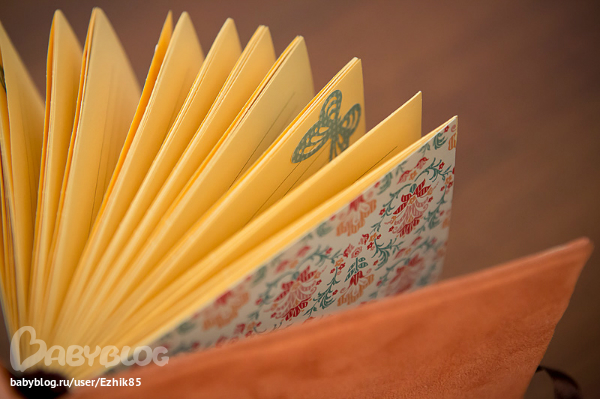 100 листов нежно-персиковой бумаги, разлинованной в фотошопе.На страницах живут бабочки и дизайнерской бумаги. Она же на форзацах.Обложка - чипборд, укрепленный флисом и обернутый в мягкую рыжую искусственную замшу. Боковая часть украшена металлическими брадсами медного цвета. Закрывается блокнот на двустороннюю шёлковую шоколадную ленту.