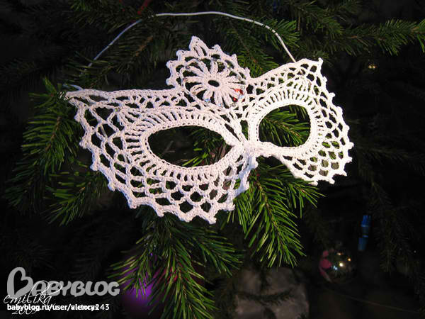 Цветочек. 1р 6вп в круг 2р 12ст. 3р состоит из 12 лепестков по 10 вп. Связать 9 лепестков, 10 зацепить за арку из 4 вп ( у переносья ) за вторую петлю от арки из 3вп., 11 лепесток зацепить за середину столбиков у переносья ,12 - за 3вп от ст2н арки из 4вп. 12 лепесток вязать так : 5вп , зацеп, ст3н. 4р Из вершины 12 лепестка арка из 3вп к 1 лепестку ,прикрепляясь к 1 арке верхнего века, далее просто арки из 3вп до 9 лепестка, между 9 и 10 арка- зацеп за первую арку верхнего века другого глаза. 5р возвращаемся по кругу , по аркам 3ст + 1ст на лепесток ,до12 лепестка. Нить оборвать. Прикрепленные лепестки арками не обвязаны. Основные элементы собраны. Завершающая ажурная обвязка. Состоит из 2 полных круговых ряда. Нить прикрепить внизу маски на середине переносья. 1р Вяжем часть ракушки из места крепления : 4 вп, 2ст1н, зацепиться за нижнее веко левого глаза , далее вязать арки из 3вп+пико из 3вп до начала ракушки у внешнего края :2 арки через 2 петли примерно, 7 арок через столбик, всего по нижнему веку 9 арок из 3 вп. Из последнего пико 7вп подьема на верхушку ракушки,пико. Продолжать на верхнем веке арки из 5вп и пико, зацеплять за середину предыдущей дуги . Всего 5 арок . В конце 5 арки вяжем "капельку" : 4вп +2ст2н + 4вп и вернуться в начало. Далее по цветочку снова арки из 5вп+пико зацепить за 3 лепесток от переносья . 3 арки до вершины , "капелька" - и в обратном порядке - к началу. От последней арки нижнего века 3 вп в нач. точку, 1ст1н , сомкнуть. Получилась ракушка из 5 лучей . Крючок в середине. 2р. 5 вп, из ст1н - ст1н, вп , ст1н, зацепить за середину первой арки левого "глаза" . Продолжать арками из 5вп , пико, цепляясь за середину предыдущих арок . Всего связать 9 арок и пико. 9 арка цепляется за середину дуги из 7 пет. От пико 5вп и ст2н в пико ракушки, 5вп за середину арки , 3вп , 2ст1н с пико между ними из середины предыдущей арки. Всего таких элементов 4. Последний зацепить за арку и каплю , чтоб не болталась , 4 арки из 5вп и пико по цветочку, цепляясь за середину арок, на вершине - пико. Таким же образом зеркалим вторую половину , завершая 1/2 ракушки на переносье. ВСЕ! Прячем концы , закрепляем сахаром (6ст. л. на 100гр воды нагреваем, маска в растворе должна остыть, сушим на полиэтиленовом мешке дня 2. Она дб умеренно жесткой , слегка гнуться , цепляем резинку ,одеваем и ходим ЗАГАДОЧНЫЕ.