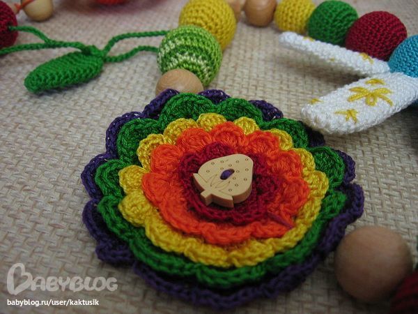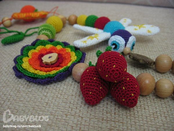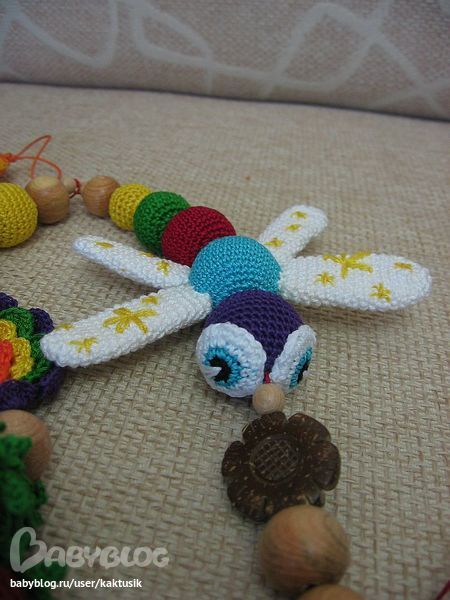 Стрекоза: желтая - бусина, зеленая - мягкая, красная - шуршащая, фиолетовая - шарик от погремушки.