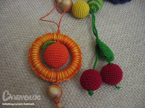 2 съемные игрушки: кольцо с апельсином и вишенки. Одна вишенка шуршит, вторая бусина