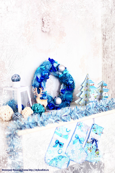 На камине - волшебный венок, украшенный бантами,бусинами и шарами.