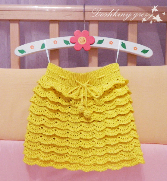 Резиночка и рюшки отсюда. Сначала связала резинку как в этом м/к. Далее с каждого ряда резинки набрала (точно не помню) или сс или сбн. И вязала веерочки, как в конце м/к (по схеме). Только веерки вязала без смещения. Думаю со смещением еще красивее будет, я про него только потом вычитала, уже пол работы было готово) Приятной вам работы над юбочкой)