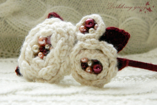 Да в общем то как такового МК нет. Розочку вязала как вот тут, только три центральных самых маленьких лепестка не провязывала (это место для бусин). А потом еще прошлась по кромке лепестков тонким крючком, провязывая на самых больших лепестках 6 петель на каждом, те что поменьше - 5 и самые маленькие по 4. Средний цветок, вяжется как большой, но без последнего ряда лепестков. Маленький - это только ряд самых маленьких лепестков. Это что касается розочек. Листочки на глазок вязала. Ободок просто обмотала нитью и на края связала наконечники (прямоугольник, сложенный пополам и зашитый по типу мешочка). Потом цветки и листочки собрала, далее пришила к ободку и прикрыла все это сверху овалом, который вяжется как стопа в пинетках)