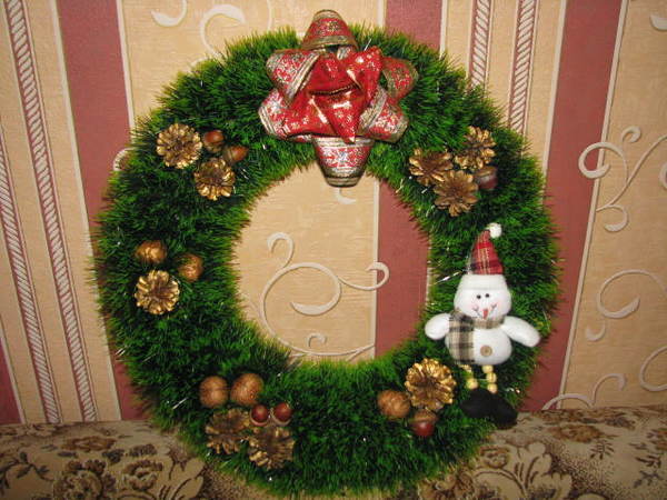 Спасибо!!! Основу сделала из газет, обмотала бумажным скотчем, а затем зеленой бумагой для творчества (не знаю как правильно она называется), потом мишура, природный материал, бант и снеговик... крепила пистолетом на горячий клеей...