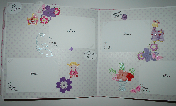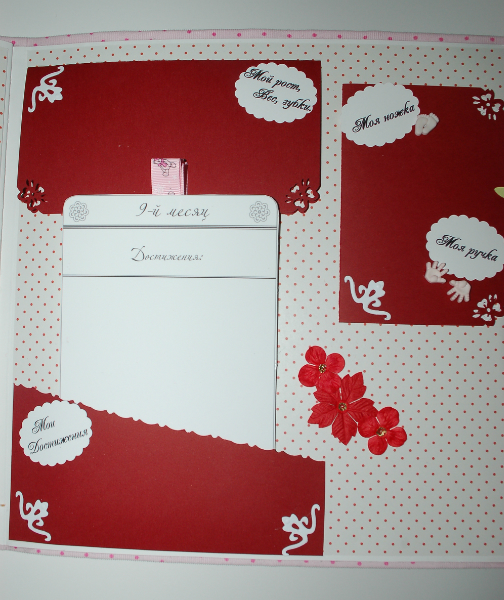разделы: "В ожидании чуда", Я родился, Выписка из роддома, Фото по месяцас с 1 по 12 мес, первый день рождения, "Таинство крещения","Мой первый новый год" Места для записи о весе, росте, зубках малыша по месяцам, места для ладошки, ножки, достижения малыша по месяцам.