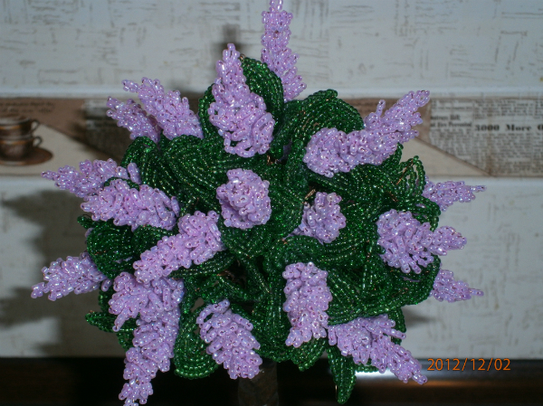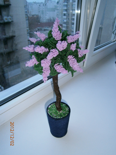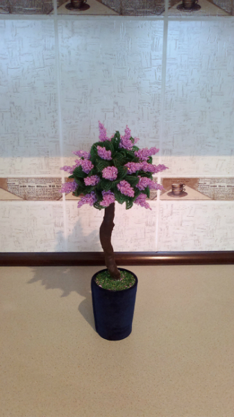 Бисер. Бисероплетение. Украшения из бисера.Думала, весеннее настроение только у меня, а оказалось, что нет)))) Вот такая сирень у меня сплелась в предверии Нового Года, высотой около 35 см, горшочек задекорировала темно синим бархатом. Ствол из проволоки и флористической ленты (2 раза пришлось разбирать ствол из гипса, один раз даже уже покрашенный, не нравились и все. Потом психанула и сделала ствол по своей обычной технологии)))