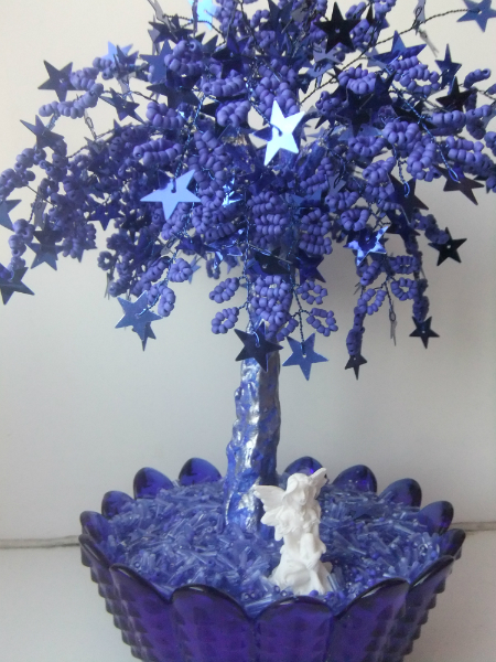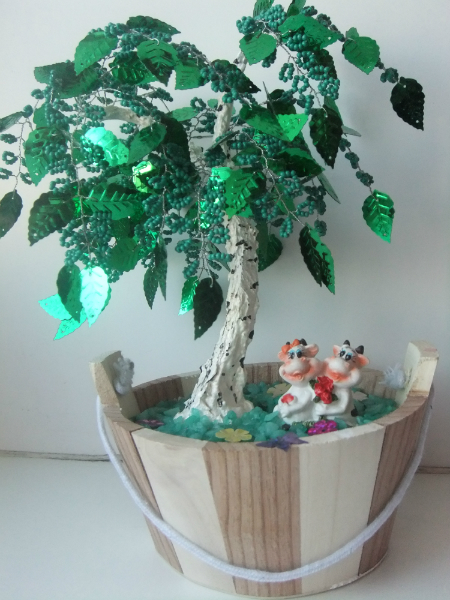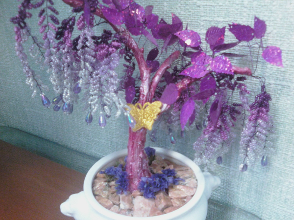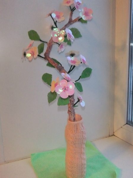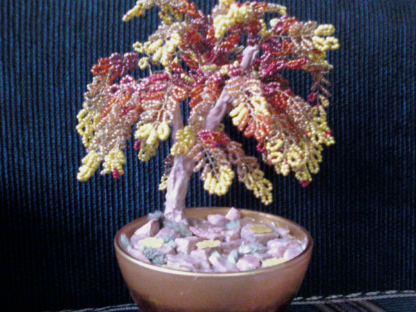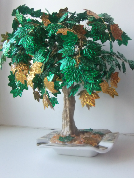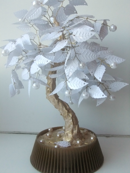 Т.е.для ствола берём длинную и толстую проволоку. Бумажным скотчем приматываем к нему ветки. Потом создаём толщину тем же бумажным скотчем. Нужно на конце проволоки оставить петлю, чтобы потом дерево не выпадало из посуды. Развожу гипс (алебастр) до консистенции густой сметаны, заливаю в форму, дерево надо чем-то поддержать пока гипс сырой. Потом разводим гипс+клей ПВА разводим водой (не жидко) и кисточкой мажу по стволу. Ветки при этом уже были обмотаны нитками. Если хотите, вышлите адрес эл.почты- вышлю подробный МК.
