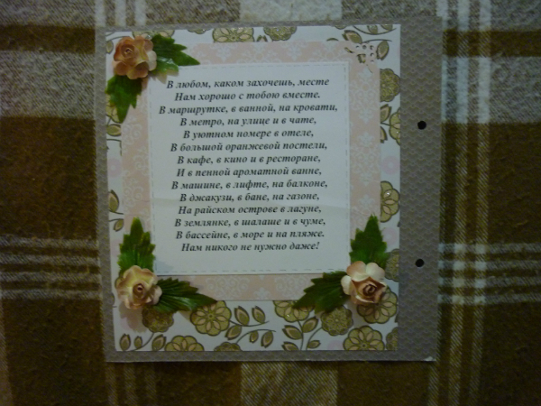 Ну стихи конечно огонь....-))) парень рифмоплет то еще))) Ну я бы добавила машинную строчку, вощеный шнур, элементы из чипборда. а то одни цветочки как то грустно...