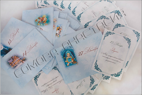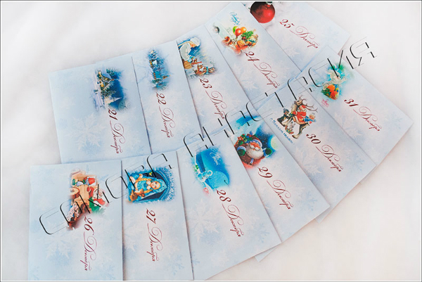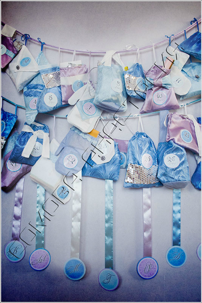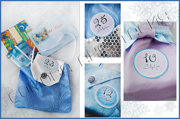 Купила ткань, к слову в нашем маленьком городке ничего нет, как в древнем веке, ткани на новогодню тему не было еще, купила что нашла более подходяшее, похожее на завитки мороза на окошках. В фш сделал конверты, распечатала на каждый день, вкладыши с заданиями, задания придумала, чтобы не повторялись, чтобы не как у всех. Материалы для выполнения заданий тоже подготовила, т.к. календарь для крестници, она уже в школу ходит, а как известно задают на дом не мало, чтобы задания адвента не были напрягом, а именно развлечением, материалы все уже готовы, только клей да рисуй))) Ну и конечно же подарочки есть, в каждом мешочке по 2 или даже больше, обязательно сладость и сувенир. Подарочки все упаковала в бумагу, чтобы все сразу не достали)))))) В общем что много говорить, смотрите что вышло!