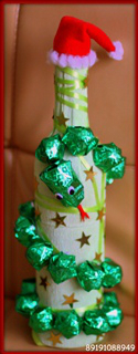 бутылку вина берете, оборачиваете гофром, поверх лентой, затем каждую конфету оборачиваете в зеленую бумагу, и приклеиваете к бутылке по кругу, голову сложнее, если будете делать, напишу...но голову я бы сделала вверх, что-то стормозила(((язычок вырезала из флиза, и шапочку тоже, вырезаете треуголники, сшиваете равнобедренные стороны, помпон и окантовку приклеиваете (сделана из ваты), и по бутылке наклеила звездочек, подарок к новому году готов!!!
