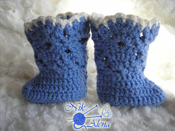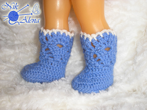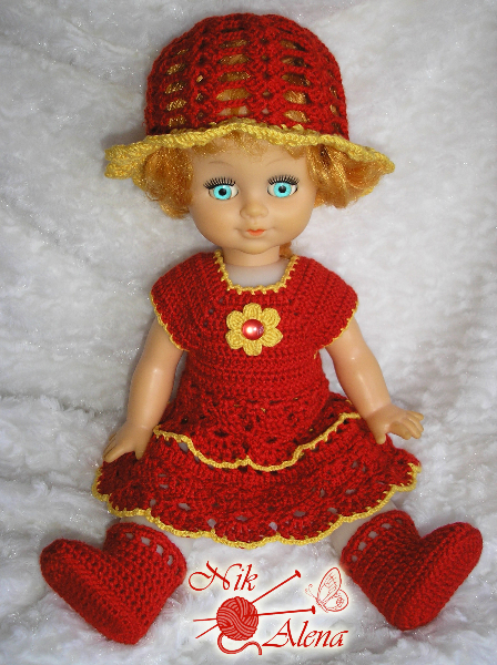 Связала я ей наряд: шляпка, платье и сапожки. Пряжу нашла в старых запасах, это какая-то распущенная магазинная кофта, которая пошла на носки и следки, и остался небольшой клубок. Использовала крючок №3, пряжа, правда, толстовата, можно было бы ее расслоить, но почему-то сразу я об этом не подумала .