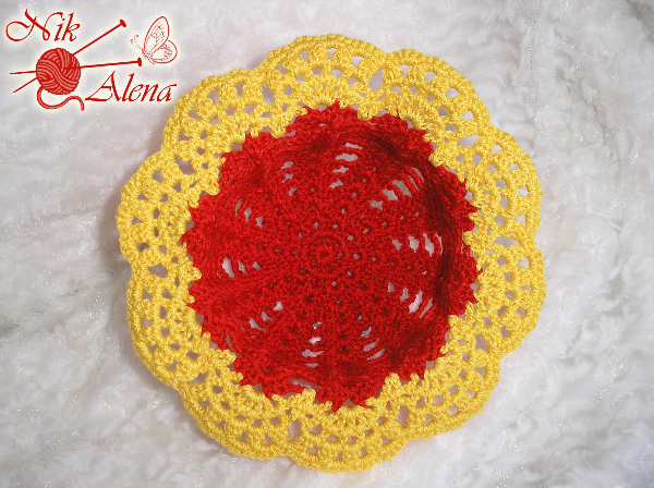 И для первой куколки связалась шляпка (красной пряжи не хватило, потому поля из желтой ниточки)
