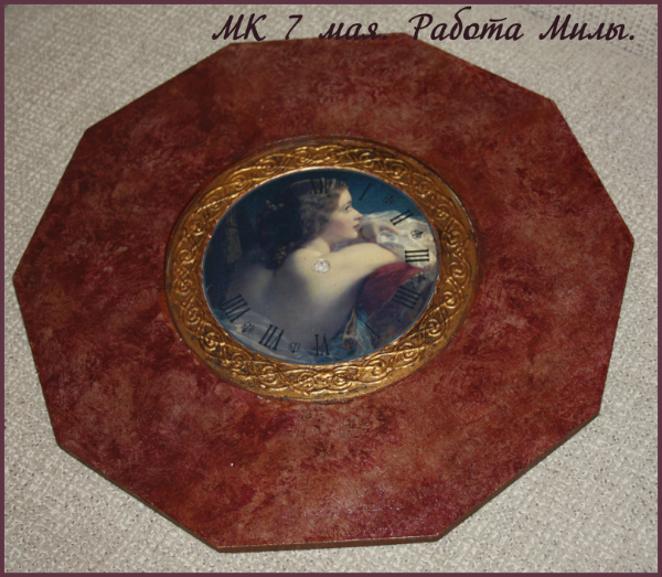 Основа часы, на такой основе мы создаем имитацию поделочного камня при помощи различных текстурных поверхностей, а так же создаем металлические рельефы различной формы (круглой обтекаемой формы и с ровными резкими краями, эффекты черненного серебра, окисленной меди, старой позолоты, бронзы), далее все старим при помощи художественных средств различными способами. В итоге девочки уходят с готовой работой.