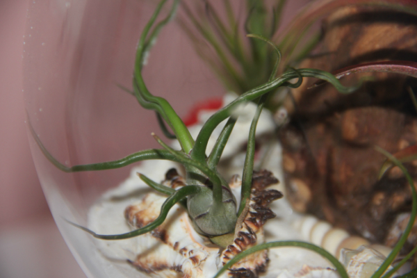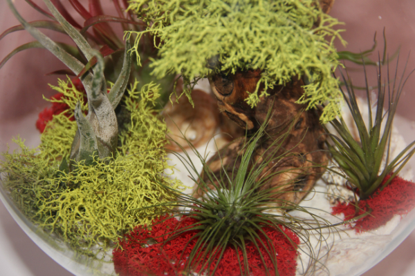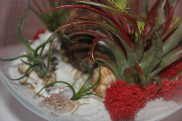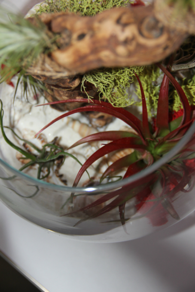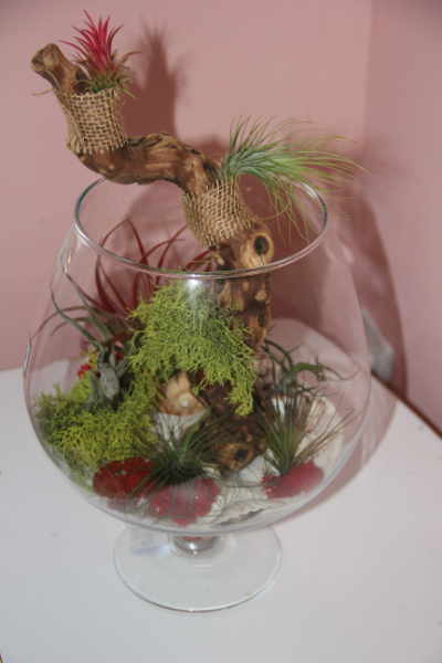 Террариум и композицию в нем я делала сама из песка, ракушек, виноградной коряги, мха ну и самих цветов)