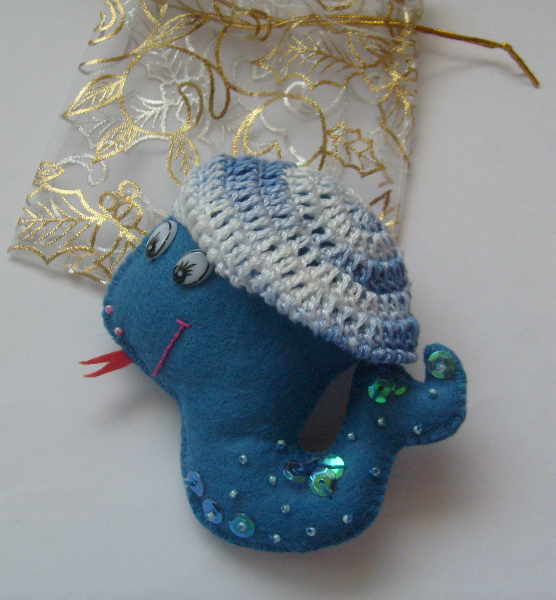 ...спряталась Змеюшка!!!!!! По-другому эту очаровашку я назвать не могу) Така модна дама! Я смотрю на неё и всегда улыбаюсь - такая она позитивная!!!!!! Определённо, быть её под нашей ёлочкой и радовать глаз! Так приятно получать подарки, сделанные для тебя чьими-то умелыми ручками!!!!!!!!!!!