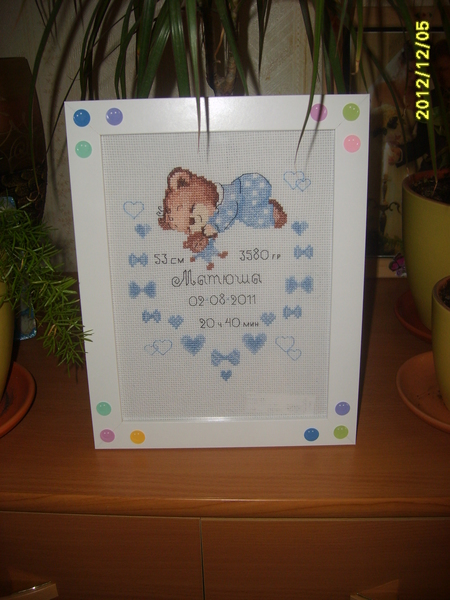 Спасибо. Самой наравится свидание, вроде такое простенькое, а красиво получилось.А я метрику быстро вышила, уж очень она мне понравилась)))И вы давайте заканчивайте с метрикой, сыночку подарок на годик будет!!!!!!!!!!!!!!!!