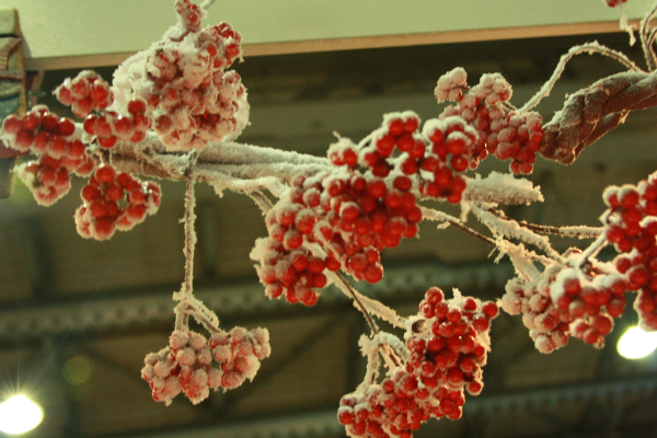 До сих пор меня мучает вопрос: как же сделали эту гирлянду? Что за спрей на рябине? На ощупь мягкий, похожий на ворс бархата. Не осыпается.