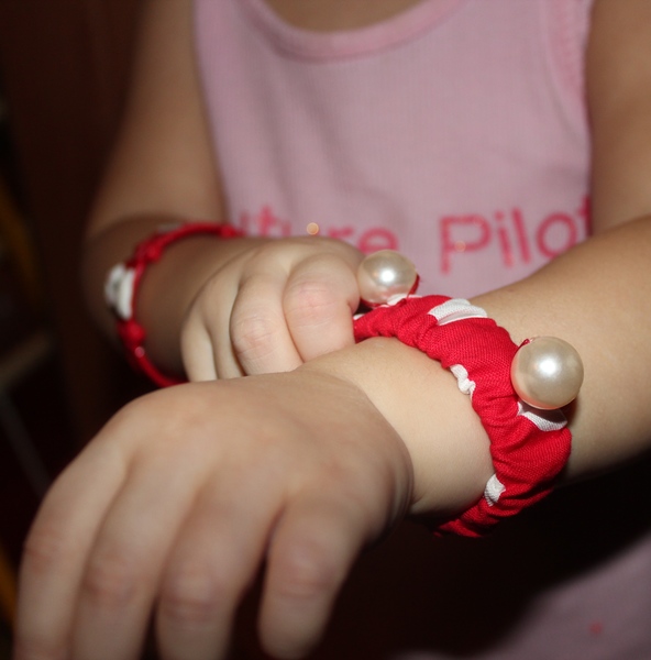Браслетик (у Алисика помимо сумочек, бусиков и брошек появилась новая страсть - браслеты - с одним уже неделю ходит, не снимая). Поэтому это аксессуар просто необходим )